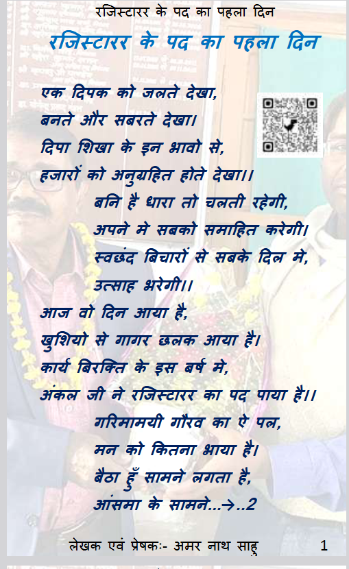 नियुक्ति के पद का पहला दिन जीवन के अनमोल पल मे से एक होता है। कर्मपथ पर चलते हुए उसके सर्वोच्य पद पर पदासिन होना एक सुखद अनुभूति तो देता ही है साथ ही गौरव का मनोवल भी सदा बना रहता है। अंकल जी के लिए यह पल ऐसा ही था। कार्य बिरक्ति के समय मे इस तरह के अवसर मिलना बाकई एक उच्च बिचार के प्रतिनिधित्व को सराहना कहा जाना चाहिए।