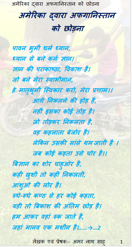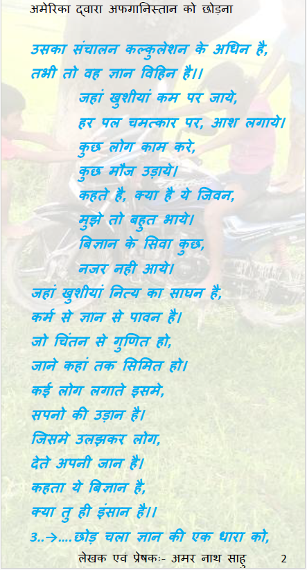 अमेरिका जैसे आया वैसे लैट भी गया। हम अपनी ज्ञान की थाली लिये आज भी अफगनीस्तान मे संभावना की तलाश कर रहे है। हमारी राजनीति को एक कुशल कारिगर की जरुरत है. जो यह सावित करे कि वह एक सफल योजनाकार के साथ शिल्पकार भी है। यह तो समय ही बतलायेगा की ज्ञान बिज्ञान की इस समायोजन मे कौन आगे निकलता है। हमारे लिए तो स्वयं के अंदर ही ऐसा ही एक लड़ाई चल रहा है। हम अपने वास्तविक जिवन शैली को छोड़कर विज्ञान के पिछे भाग रहे है। हम लगातार खुश रहने की बृति लिये आगे जाने की कोशिश करते है, कि कोई एक ज्ञान की धारा मेरा मार्ग रोककर खड़ा हो जाता है। हम वहां से निपटकर आगे निकल जाने तथा जितने की मुहिम मे है।