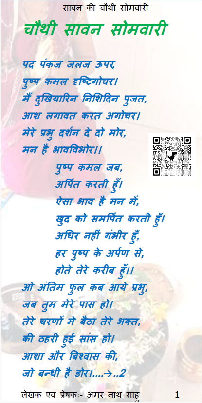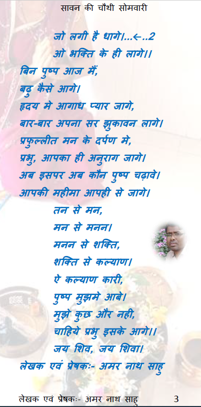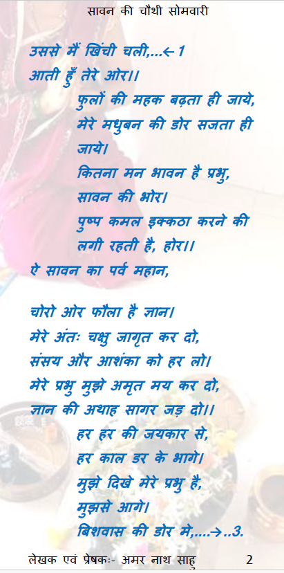 हे भगवान सदाशिव, सावन की सोमवारी का ऐ महान पर्व जो आपके द्वारा भक्तो को प्राप्त हो रहा है, उसका पुर्ण लाभ उसे मिले जो आपको याद करता है तथा जो सदा आपको गुणगान करता है, यही हमारी कामना है। हमारा ध्येय एकाग्रचित बनाने की कला को एक उपाय प्रदान करना है। आप तो त्रिकालदर्शी है, आपसे कुछ भी छिपा नही है, लेकिन प्रेरणा पाकर जो सर्वश्व अर्पित करता है, वह आपके ज्यादा करीव होता है। इसी को साधना मानकर हम यह कविता को भक्त तक पहुँचा रहे है। हमारा भाव लोगो को यथेष्ठ लगे इसी कामना के साथ एक पुष्प दल आपको अर्पित करते है।