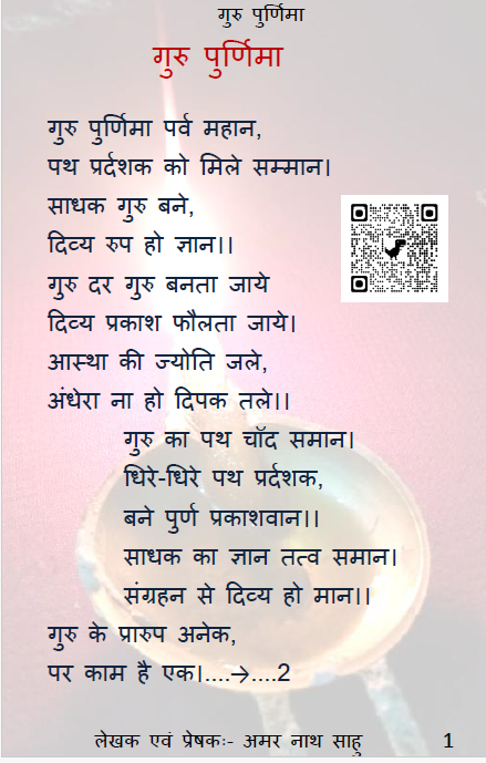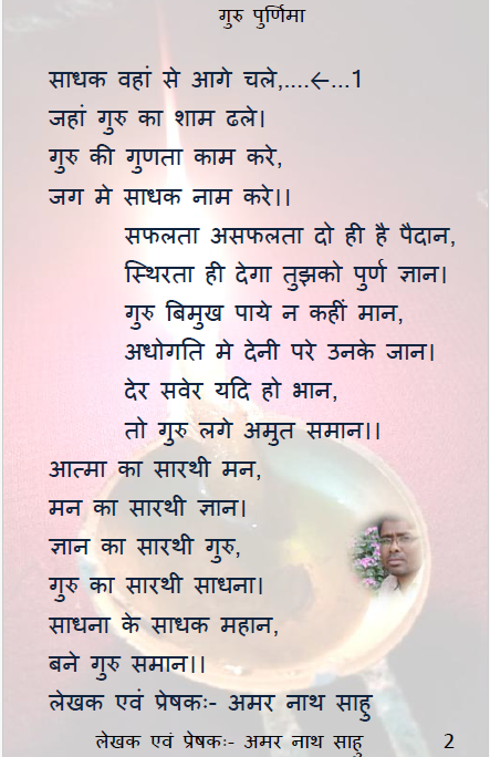 गुरु के सृजीत पथ पर चलकर जो हमारा कल्याण होता है उसकी भरपाई हम शब्दो मे नही कर सकते है। सफलता का सोपान पाने के लिए गुरु का मार्गदर्शक होना ऐसी ही जरुरी है जैसे पानी मे नाव को खेने के लिए नाविक का होना जरुरी होता है। यह पर्व हमें संकल्प देता है कि गुरु की गाथा को जगाये रखे जिससे स्वयं के साथ ही जगत का कल्याण संभव हो। नयी चुनौती का सामना करने के लिए हमे एक प्रारुप की जरुरत होती है जिसमे गुरु सहायक होते हैं। जिसके सहारे हम चलकर लक्ष्य को प्राप्त कर लेते है।