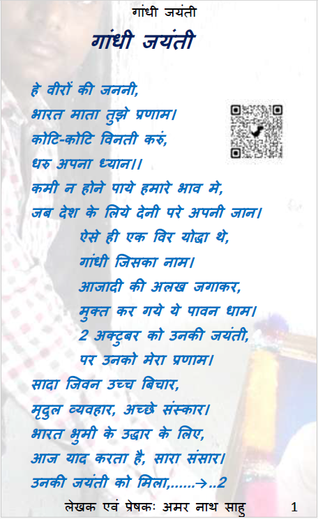 2 अक्टुबर को गांधी ज्यंती मनाई जाती है क्योकि इसी दिन गांधी जी का जन्म हुआ था। गांधी एक विचार का प्रवाह है जो किसी भी मुश्किल कार्य को हल करने के लिए जन जानगरण के साथ एक स्वास्थ्य विचार का सम्प्रेषण करने को प्रेरित करता है। स्वार्थ का दायरा संकिर्ण होता है। इसमे जीने वाले लोगो को सदा डर बना रहता है क्योकि उसके सिमित दारये मे सुख खोजने के कारण वह कुंठित होकर रह जाता है। इसके कारण वह तरह – तरह के तरकीव लगाने लगता है। जिसके बाद वह खुद को असहज महसुस करने लगता है। गांधी के विचार सत्य के करीव पहुंचकर सबको ये सदेश पहुंँचाने की क्रिया से जुड़ा हुआ है। जब सत्य की पराकाष्ठा अधिक होती है तो लोभी लालची और सुख भोगी अपने आप ही अलग हो जाते है।