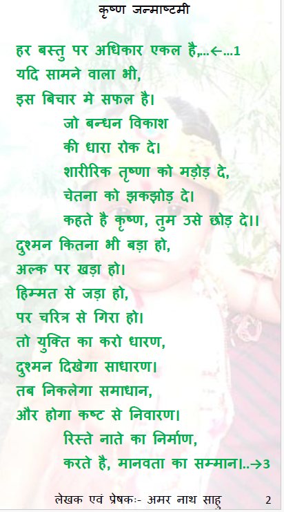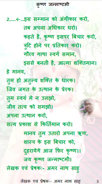 हे मानव भगवान कृष्ण जो हमें समझा गये उसे नियमित जीवन मे भी लाना है, जिससे की मानव अपने सर्वोच्य उत्कर्ष को पा सके। कृष्ण की सच्ची भक्ती भी यही है। हे कृष्ण, आज मैं निष्चय करता हुँ कि स्वयं के सहित हम अपने राष्ट्र को भी सर्वाच्चता प्रदान करेंगे। इसके लिए हर जरुरी प्रयास करने का संकल्प लेता हुँ। आपने कहा की प्रयास करना हमारा नियति होना चाहिए। निष्कर्ष पर बिवादित बिचार रखना स्वयं के प्रयास को खत्म कर देता है। इसलिए हमारा कार्यन्मुख बिचार सबके लिए एकात्म बने ये कोशिश जारी रहेगा। जय कृष्ण जन्माष्टमी।