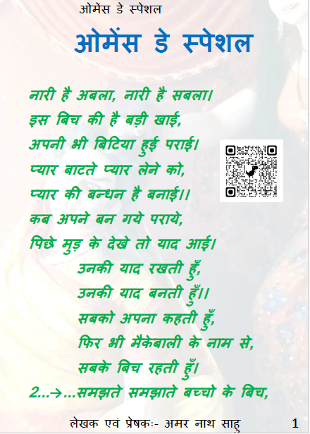 ओमेंस डे को नारी के उत्थान के लिए किये गये कार्यो की समीक्षा तथा भविश्य के कार्य के लिए भावी योजना के निर्माण हेतु मनाया जाता है। यह दिन बिशेष रुप से नारी को समर्पित है। नारी के विभिन्न रुप से हम सब अवगत है। उसको समाज मे सम्मान मिले जिससे आने वाली पीढ़ी का मनोबल ऊचाँ रहे। बच्चो की प्राथमिक पाठशाला परिवार ही होता है, इसलीए नारी के सम्मान से ही नवीन समाज के उत्थान की नीव पड़ेगी। उसके उत्थान की जब चर्चा चलती है, तब हम अपनी पराकाष्ठा को बिच मे रखकर उसका बिकाश खोजते है। यही से नारी की समस्या बनने लगती है। उनको अवला और सबला दोनो रुप मे समाज मे होने पर मजबुर होना पड़ता है।
