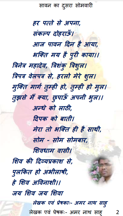 - पहला, दुसरा, तीसरा, चौथा सोमवारी ब्रत के भक्ति रुप का वर्णन तथा हमारी कामना को दर्शाता यह काव्य रचना एक अनुपम कृती है।