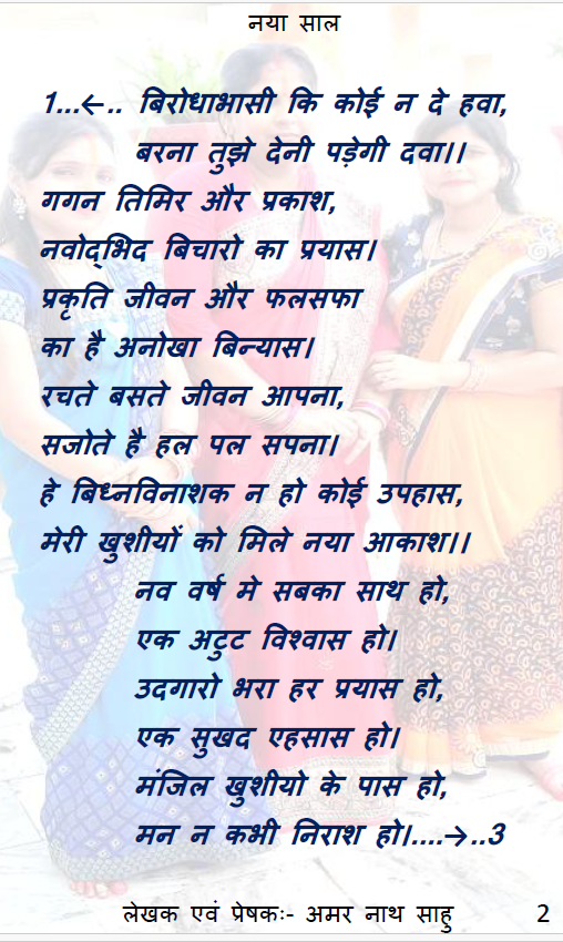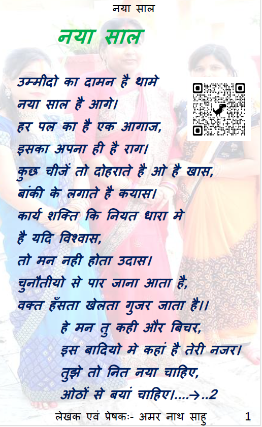 प्रकृति की अनुपम गाथा का नवाचार हमे आगे बढ़ने के लिए प्रेरित करता है जिसके लिए हम सतत प्रयत्नशिल रहते है। नया साल का चित्रण हमारी उज्जवल भविष्य की ओर देखने के नजरीये के साथ हमें उर्जावान बनाता है जिससे की हम स्वयं को व्यवस्थित करते हुए बेहतर कल का निर्माण करते है।