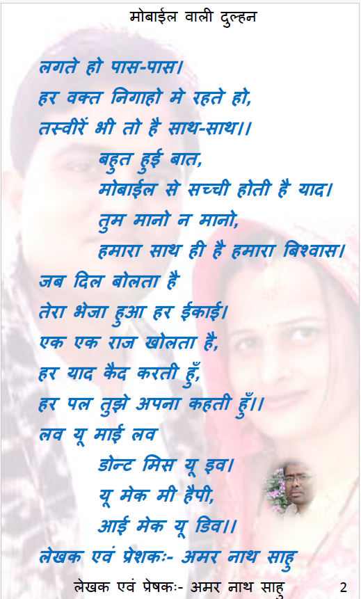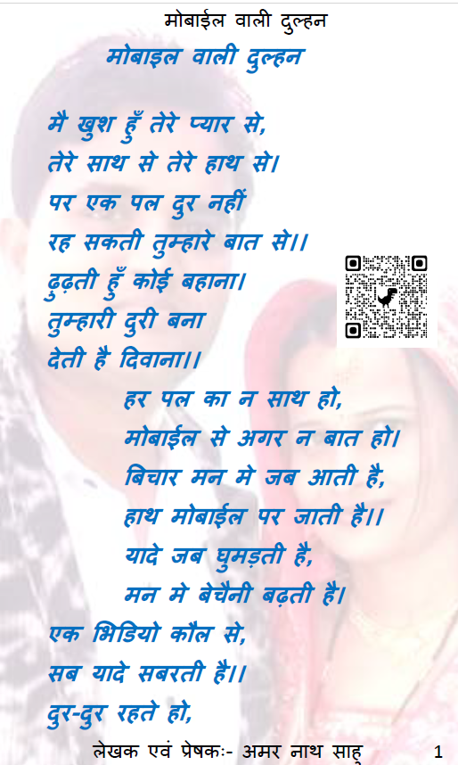 मोबाईल के इस युग मे लोगो को अपनी बात कहने का एक आसान साधन मिल गया है। अपने भाव को दुसरों तक पहुँचाने मे इसका प्रयोग तेजी के साथ हो रहा है। हमारी भाव का प्रारुप दुसरे भाव को शेयर करने तक सिमित रह गया है। कहीं न कहीं हमारी मुल भावना का लोप दिखाई दे रहा है। फिर भी हम आजकल के भागमभाग जिंदगी को मोबाईल से दुर नही कर सकते है। यहाँ मोबाईल वाली दुल्हन के रुप मे हम आजकल के जिंदगी के एक प्रारुप को व्यक्त करने की कोशीश कर रहे है आशा है हमारी यह प्रयास आपको पसंद आयेगा।