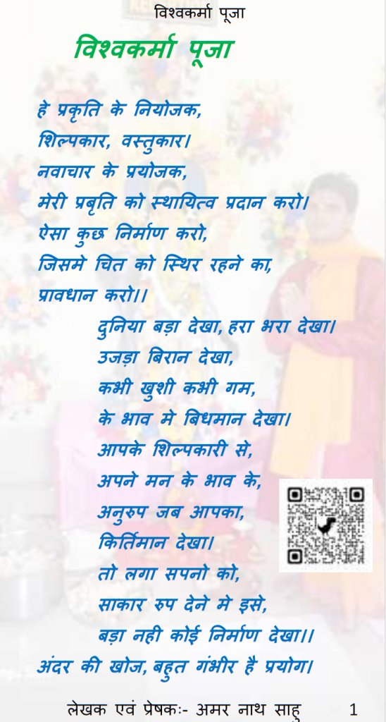 हे हमारे अराध्य भगवान विश्वकर्मा हम प्रति वर्ष आपके शक्ति को आत्मसात करने के लिए भावपूर्ण नियोजन के साथ आपका आवाहन करते है और स्वयं को ऊर्जावान करते हुए जीवन उत्कर्ष को प्राप्त करने हेतु अग्रसर होते है। हमारी सफलता आपके कृपा दृष्टी पर ही आधारित होती है, इस हेतु हम पर अपनी कृपा बनाए रखना। हमारी शक्ति को जगाए रखना। हम सबसे आगे रहे इसके लिए हमारी भक्ति से हमपर मार्ग दर्शक दृष्टि बनाए रखना।।