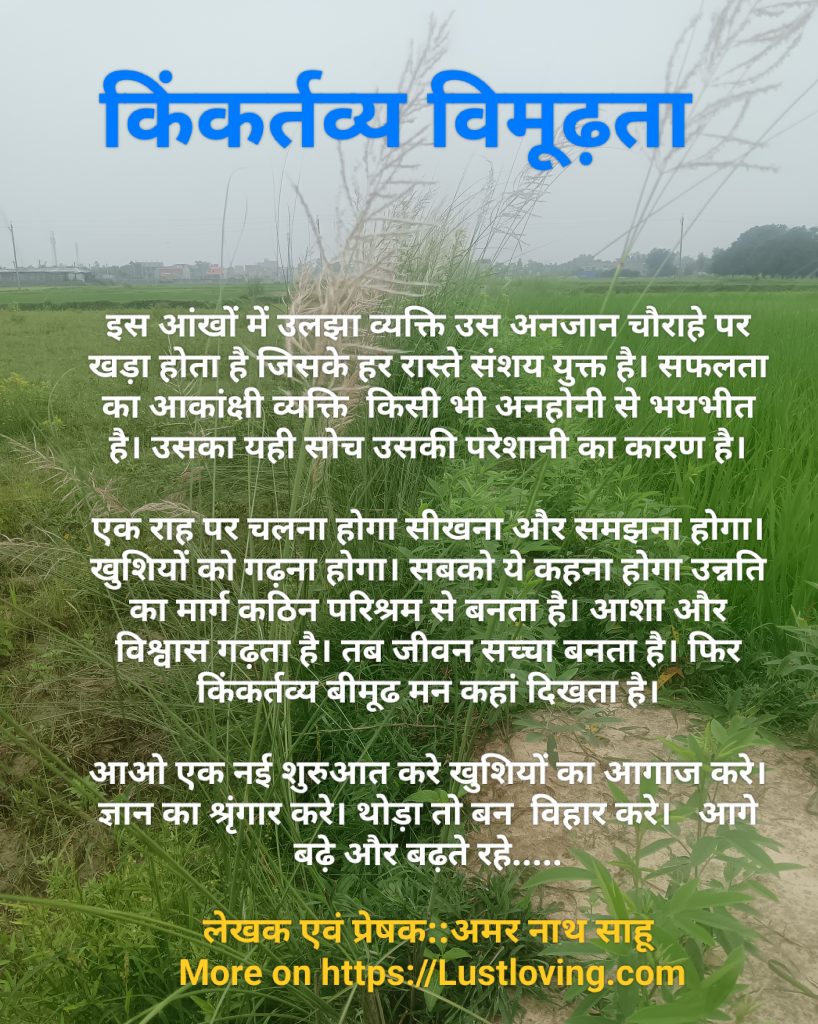 लक्ष्य को साधित करने के बाद उसको पाने के लिए किये जा रहे प्रयास मे जब वाधा उत्पन्न होती है तो व्यक्ति सामाधान ढ़ुढ़ता है। यही पर किंकर्तव्यविमुढ़ता की स्थिती आती है। व्यक्ति के अंदर समाधान के लिए गुण की कमी, संसाधन की कमी या व्यवस्था की कमी जैसी अनेको समस्या आ खड़ी होती है। वह ऐसे चौराहे पर खड़ा होता है जहां से अनेको रास्ते निकलते है सभी रास्ते मे कुछ कमी और कुछ सही नजर आता है।