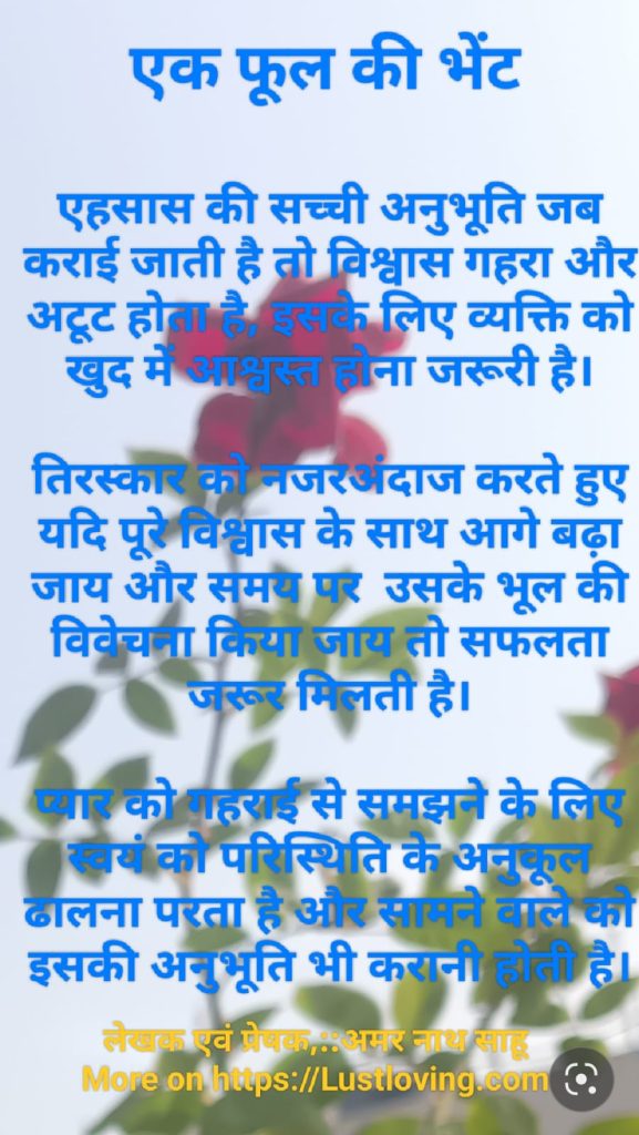 एक फुल की भेंट ने एक एहसास को जगा दिया। एक भुल को एक गहरे एहसास से साथ मिलाकर एक दुसरे के प्रति नजरीये को बदल दिया। हमे एक दुसरे को समझने और परखने के लिए यक्ति पुर्ण कार्य करना होता है क्योकि हमारा मन सतत ही क्रियाशील रहते हुए बहुत कुछ सिखता है और बहुत कुछ भुलता भी है उसके लिए हमे एक युक्ति लगानी होती है जिससे की स्थापित विचार को समझा जा सके और उसका समय से स्वयं के लिए सावांरा जा सके।