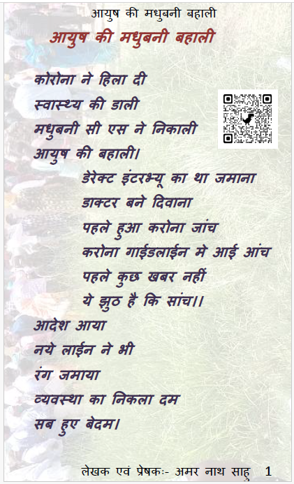 मधुबनी सी एस द्वारा आयुष की बहाली करोना रोगी को नियंत्रन करने को लेकर निकाला गया था। जो करोना रोगी को कम होने के कारण रोक दिया गया। लेकिन खबर आयी की एम बी बी एस की बहाली ली गई है। बर्तमान समय मे समाज मे एक खास चिकित्सा के प्रति लोगो का झुकाव का कारण को देखते हुए सरकार कोई नई पहल नही करना चाहती है। राजनैतिक बिबसता का कारण विकाश मे बाधा का पहुँचना एक पुरानी प्रक्रिया है। इसके बाबजुद हमलोग इसके साथ जीने को आदी हो गये है।