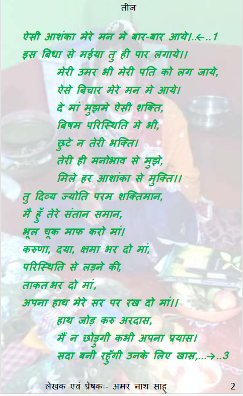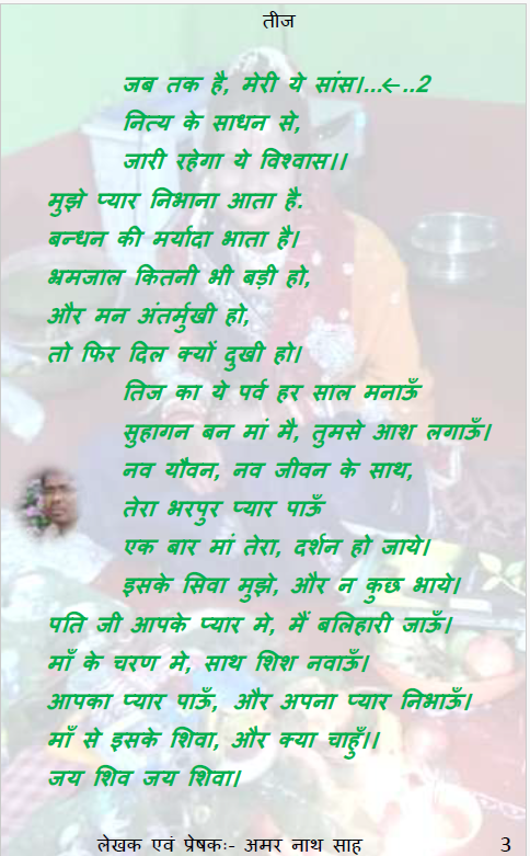 तीज का ये हमान पर्व हमे सुख शान्ति दें तथा प्रशंसित करे। हम लगातार आगे बढ़ते रहे और हर तरह से एक खुशहाल जीवन को जीते हुए लोगो के लिए एक आदर्श छोड़ जाय इस कामना के साथ आप सभी आत्मीय बन्धु को हमारा नमस्कार। तीज करने वाले व्रतधारी को हमारा सह्रदय नमस्कार प्राप्त हो।
